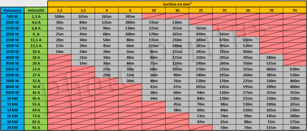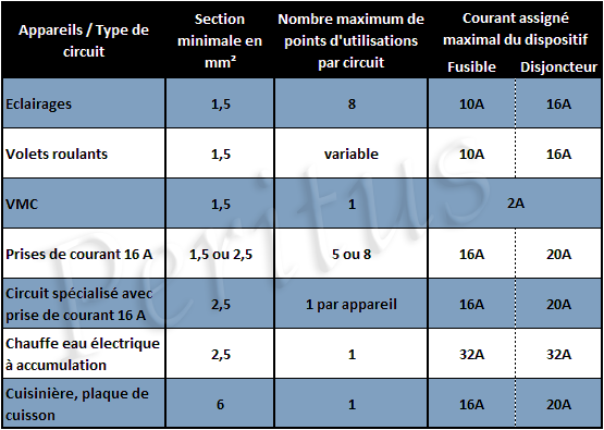 Tableau des sections de fils par type de circuit et nombre de point avec dispositif de protection.