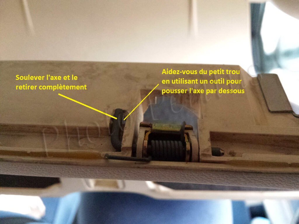 Pour retirer l’axe de la charnière, pousser celui-ci par dessous à l’aide d’un outil fin. Une fois soulevé tirer sur l’axe pour le retirer.