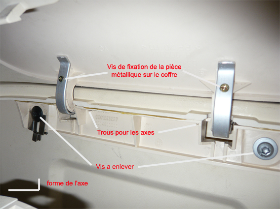 Commencer par dévisser les deux vis à côté des charnières dans les deux coffres. Pour plus d’aisance je dévisse aussi les deux autres vis au fond de chaque coffre.