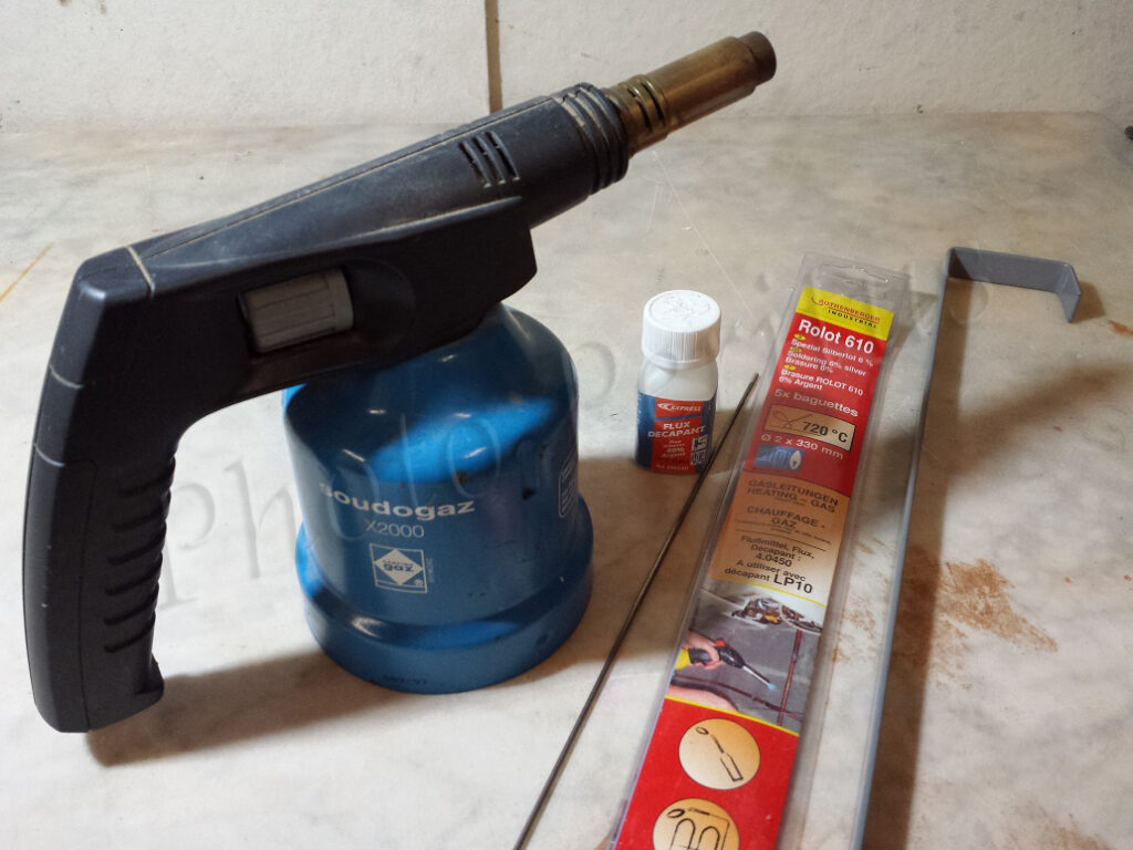 Je vais avoir besoin de faire une petite brasure, comme vous pouvez le voir je n’ai pas un super chalumeau mais ce sera suffisant. Il est doté tout de même d’un bec spécialement conçu pour les soudures. Ensuite des baguettes de brasure à l’argent et du décapant.