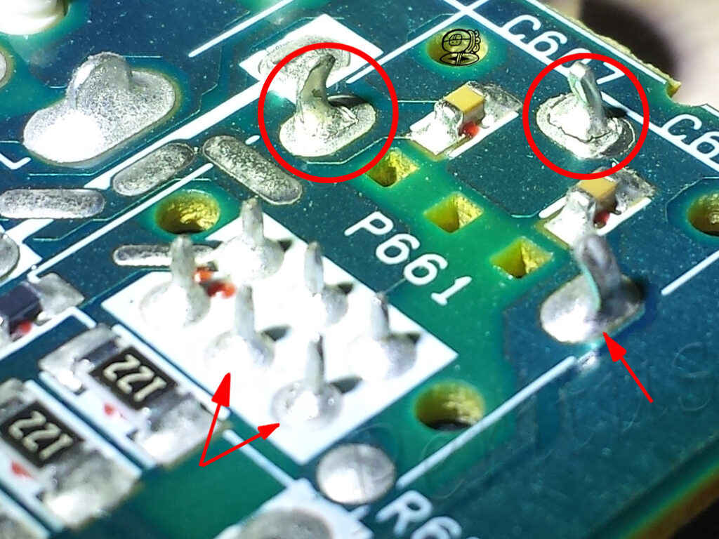 Généralement lorsque l’on voit un cercle sur la soudure autour d’une pin c’est que la soudure a cédée. On a alors un contact intermittent voir plus aucun contact du tout. Facile à réparer, il suffit de refaire la soudure au fer à souder avec un peu d’étain.